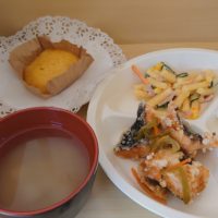 給食メニュー ・ごはん 鮭の南蛮酢 スパゲッティーサラダ 味噌汁(さつまいも・大根) 午後のおやつ ・にんじん蒸しパン 牛乳 今日のポイント 南蛮酢は甘めのたれにすることで、こどもも食べやすくなって …
